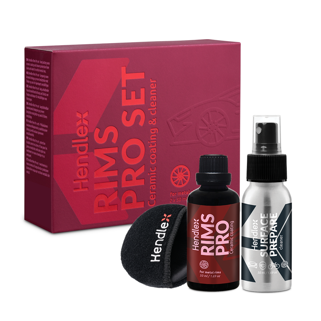 Hendlex Rims Pro protection set is designed to be used on metal vehicle rims. Included cleaner helps ensure proper surface preparation for ceramic coating application and a nano ceramic coating protects vehicle rims. The ceramic coating enhances the color of rims, gives it a glossy shine, prevents dirt, brake dust, and other contaminants from sticking to the surface, it means rims become easier to clean and requires less maintenance. Also Hendlex Rims Pro ceramic coating protects the vehicle rims from adverse environmental impacts, such as acids, alkalis, road salts and UV rays.